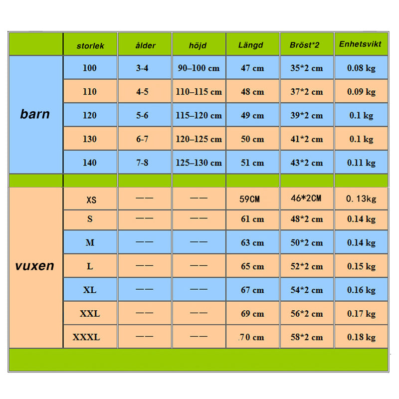 - Available in sizes for both adults and children, including XS to XXXL and sizes for children between 100-140.