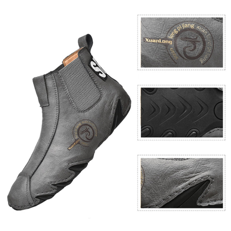 "Herrstövlar av äkta läder med handsömmar, dämpande sula och slitstarkt greppmönster, snygg tidlös design."
